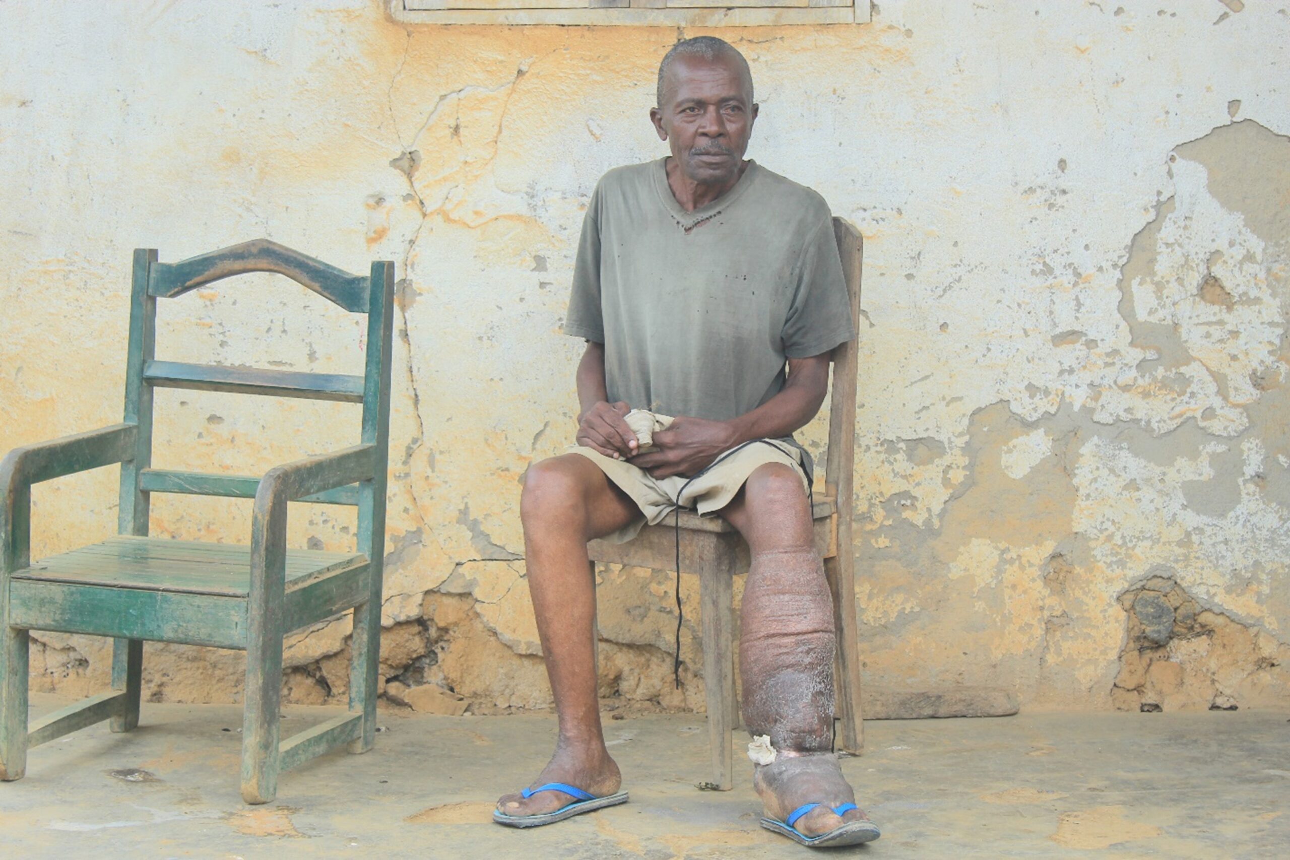 The painful and profoundly disfiguring visible manifestations of the disease occur later in life and can lead to permanent disability. Once the disease reaches this stage, the effects have no cure. Patients are not only physically disabled, but suffer mental, social, and financial losses contributing to stigma and poverty. As the health workers explained more about the disease and the medicines that could help prevent further infection, Biaback took off the bandages, allowing the distributors to see the nature of his left leg. Almost in tears, he shared how lonely his life had been.